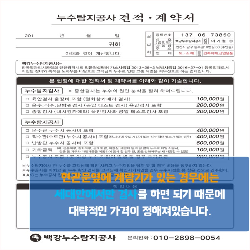 우리 주변에는 늦은 대응으로 인해 아래 집에 상당한 피해를 입게 되어 엄청난 스트레스를 받고 있는 분들이 의외로 많습니다. 저희 광진구 누수탐지회사는 이런 어려운 상황에 처해있는 분들을 위해 자체적인 법률상담사를 보유하고 있습니다. 인력을 채용하여 상담 서비스를 제공하고 있습니다. 솔루션을 통해 문제 해결의 도움을 받고 싶으시다면 언제든지 연락주시고 필요한 상담을 받아보세요. 벽의 상태는 천장의 상태와 비교할 수 없을 정도로 나빴습니다. 벽지가 다 떨어져서 곰팡이 흔적이 가득했어요. 특히 곰팡이는 집안에 악취를 유발할 뿐만 아니라 피부 알레르기를 유발할 수도 있습니다. 그렇게 할 수 있기 때문에 더 위험할 수밖에 없습니다. 바닥이 파손된 곳도 찾아냈고, 고객이 전화하기 전에 이미 3개 업체가 방문한 것으로 드러났습니다. 두 달 전부터 집 안으로 물이 새어 들어오기 시작해서 도움이 필요했습니다. 요청했다고 합니다. 하지만 이들 중 2곳은 누수 원인조차 제대로 찾지 못한 채 출장비만 징수하는 무책임한 행동을 보였다. 다른 한 분은 집 바닥을 임의로 깨서 공사를 했으나 그 이후에도 누수 현상이 계속됐습니다. 그래서 2개월에 걸쳐 3곳에 도움을 요청했지만 결국 아무런 문제도 해결되지 않았고 210만원의 비용과 시간이 낭비됐다. 저희 광진구 누수탐지업체에서는 원천까지 도달이 불가능하다고 하며, 당연히 출장비는 0원이므로 피해를 입을 가능성은 없습니다. 각종 내시경, 열화상 카메라, 탐지기 등을 이용해 원인을 육안으로 찾는 방식이 아니기 때문에 고장 가능성은 사실상 0에 가깝다. 수로의 시작점을 결정합니다. 나는 적당한 장소를 찾기 위해 집 내부를 조사하기 시작했습니다. 광진구 누수탐지를 단계별로 진행하던 중 보일러 배관에서 물이 새고 있는 것을 확인할 수 있었습니다. 먼저 바닥에 매설된 난방관, 직수관, 온수관 등을 모두 점검해야 했기에 조심스럽게 바닥을 파헤쳤습니다. 나는 그것을 당신에게 주었다. 앞서 말씀드린 대로 고객님의 집에 있는 수원지와 무관한 곳에서 파손이 발견되었습니다. 광진구 누수탐지업체는 정확한 증거에 근거한 감지가 아닌 단순한 의심으로 바닥을 깨뜨려 고객에게 피해를 입혔다. 놀랍게도 그 수가 많습니다. 그러므로 급하다고 아무 데나 전화만 할 것이 아니라 실력이 검증된 곳을 찾아 파견을 요청해야 한다. 내시경과 열화상 카메라를 이용해 보일러실 배관의 손상된 부분을 정확히 찾아낸 뒤, 내부에 물을 주입한 후 공기를 주입해 공압 테스트를 진행했습니다. 그 결과, 파손된 부위를 통해 공기가 누출되면서 공기압이 지속적으로 떨어지는 것으로 확인됐다. 사실을 알게 되었고, 이곳이 발원지라는 것도 확인할 수 있었습니다. 주범은 온수관이었는데, 균열의 크기가 비교적 크고, 주변 밸브도 노후화되어 있어 모두 새것으로 교체하기로 결정하였습니다. 언제 부품을 교체해야 하는 상황이 발생할지 아무도 모르기 때문에, 저희는 항상 배송 전에 모든 부품을 가지고 갑니다. 저희 광진구 누수탐지업체에 근무하는 기술자들은 모두 해당분야 경력 15년 이상의 전문가들입니다. 그러므로 원하는 결과를 보다 빠르고 정확하게 생산할 수 있고, 덕분에 맘카페와 당근에도 입소문이 퍼지게 된다. 가능해졌습니다. 모든 파이프와 밸브를 새 것으로 교체한 후에는 바닥을 깨끗이 이전 상태로 복원해야 합니다. 이때 이전업체에서 피해를 입었던 부분을 모두 복구하여 고객의 스트레스를 해소해 드립니다. 나는 그것을 해결할 수 있었다. 예상치 못한 사고로 인한 손해를 방지하기 위해 다양한 책임보험에 가입되어 있습니다. 고객님에게 발생할 수 있는 손해에 대해 사전에 만반의 준비를 갖추고 있으니, 안심하고 작업을 맡겨주셔도 됩니다. 당신이 해야 할 일은 그것을 주는 것뿐입니다. 지금까지 200만원이 넘는 많은 돈을 들여 3곳의 업체에 작업을 아웃소싱했지만 매번 실패의 연속이었지만 단 한 번의 시도로 문제를 해결할 수 있었습니다. 고객들은 더 이상 연이은 장애로 인해 시간적, 금전적 손실을 입을 필요가 없다며 매우 기뻐했습니다. 집에 물이 새는 조짐이 조금이라도 보이면 즉시 조치를 취하여 나중에 발생할 수 있는 큰 피해를 예방해야 합니다. 입소문으로 실력을 인정받고 성공률이 높은 업체에 연락주시면 만족스러운 결과로 여러분의 기대에 부응해드리겠습니다. 저희 회사는 다음을 약속합니다. 1. 1년 365일 당일 A/S를 제공합니다.2. 전국 24시간 30분 이내 로켓 출장을 무료로 제공해드립니다. 3. 최신 장비와 10년 이상의 경험을 갖춘 전문가들이 문제를 해결해 드립니다. 도움이 필요하시면 저희에게 연락해주세요. (전국 30분 이내 현장 무료 서비스)
