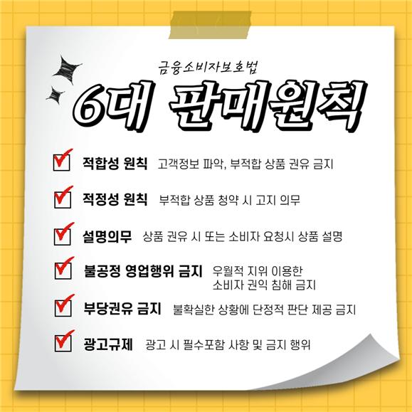 먼저, 금융회사가 금융상품을 판매할 때 준수해야 할 판매원칙을 명시했습니다. 항목을 나열하면 적합성과 타당성의 원칙, 설명의무, 불공정거래행위 금지, 부당청탁 금지, 허위·과대광고 금지 등이 있다.