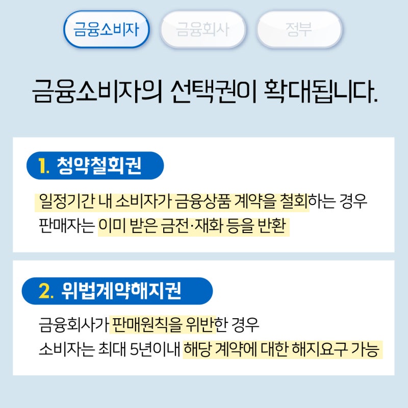 위 판매원칙을 위반한 경우, 일정 기간 이내에 소비자가 계약 해지를 요청할 수 있도록 변경되었습니다. 금융회사는 수락 여부를 10일 이내에 통보하여야 하며, 거절하는 경우에는 거절사유도 함께 통보하여야 합니다. 청약철회권 강화