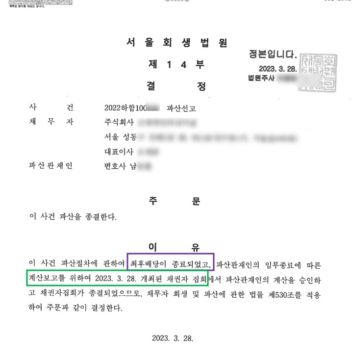 김요한 대한법무법인 대표 전) 서울중앙지방법원, 수원지방법원 판사 전) 국내 4대 법무법인 세종 변호사협회 ‘기업자문변호사’ 인증 세무전문변호사 (국내 0.5%) 부동산 변호사 (국내 1.8%) 서울대학교 법과대학원 석사과정 수료를 포함해 총 5개 대학원에서 석사, 박사 학위를 취득했습니다. 기업회생 1,110억 원. 부채회생이 승인되었습니다. 부채금액 186억 원의 기업회생 사례. 걱정하실 수도 있다는 걸 잘 압니다. 기업부도가 성공하기 위해 너무나 절실한 상황에 처해 계시는데… 어떻게 파산종결 결정을 내려야 할지 막막하셨을 것입니다. 기업 파산은 파산종결 결정을 받으면 끝난다고 합니다. 신청서를 어떻게 준비하는지 궁금하실 것 같아요. 그런 분들을 위해 26년 변호사 경험을 바탕으로 다음과 같은 말씀을 드리고 싶습니다. . 실제로 고액의 수수료를 받고 제공하는 노하우이니 3분만 집중해주세요. 인터넷 어디에서도 쉽게 찾을 수 없는 유용한 팁을 얻으실 수 있을 것 같아요. 파산 종료 결정? 다섯 가지 핵심 사항이 있습니다. 기업도산은 모든 채무를 청산하고 회사를 깔끔하게 청산할 수 있도록 하는 제도로, 부채가 눈덩이처럼 쌓여 당장 회사를 청산해야 하는 분들에게 탁월한 제도입니다. 그러나 장점이 큰 만큼 성공으로 이어지는 것은 쉽지 않다. 실제로 지원한 기업 중 70% 이상이 실패한다고 해도 과언이 아니다. 따라서 지원서 접수부터 전 과정에 걸쳐 사실관계의 노하우가 요구되는 경우가 많습니다. 그래서 먼저 기업 파산 절차의 5가지 주요 단계를 요약한 칼럼을 공유하겠습니다. 절차뿐만 아니라 각 단계별 성공 노하우가 담겨 있는 매뉴얼이기 때문에 참고만 하시면 ‘미흡한 준비’로 인해 실패하는 상황은 최소한 방지할 수 있지 않을까 싶습니다. 기업 파산 절차는? 변호사가 진행하는 기업 파산 절차의 A부터 Z까지? 26년 경력의 변호사의 확실한 노하우를 살려 초등학생도 쉽게 이해할 수 있도록 정리해드립니다. blog.naver.com 물론 이렇게 절차를 정리했다고는 하지만… 위의 칼럼 하나로는 절차에 완벽하게 대응하기는 쉽지 않을 것 같습니다. 이런 분들을 위해 대표님들이 가장 많이 실수하는 단계 중 하나를 좀 더 자세히 짚어드리겠습니다. 지원서를 제출한 후 첫 번째 응답이기 때문에 잘 준비하시면 보다 쉽게 ​​응답하실 수 있는 발판이 되리라 믿습니다. 기업 파산 대리인의 심문 대응 절차 노하우를 보신 분들은 아시겠지만, 기업 파산에는 신청 후 대리인이 판사와 직접 대면하는 단계가 있습니다. 이때, ‘판사’가 신청과 관련된 질문을 직접 질문합니다. 이 질문은 기업의 부도를 악용하여 상환하지 않을 의도로 신청을 했는지, 과연 부채를 줄일 수 있는 기업인지를 확인하는 질문입니다. 따라서 귀하가 제출한 신청서에 위와 같은 의혹이 제기될 예정입니다. 낯선 수사실 환경, 판사와의 첫 만남… 실제로 위 환경에서 CEO는 기업 파산이 절실한 상황임에도 불구하고 제대로 대답하기 어려운 경우가 많다. 다만, 이는 신청서 제출 후 첫 번째 단계이므로 철저한 대응이 중요합니다. 적절하게 대응하지 않을 경우, 적절한 절차가 수행되기 전에 수많은 수정 명령이 결국 실패로 이어질 가능성이 높습니다. 이에 저는 26년의 변호사 경험을 바탕으로 판사가 판사라는 관점에서 바라보는 핵심 질문 두 가지를 정리했습니다. 이를 참고하시면 일반적으로 대표님들이 어렵다고 생각하는 심문과정을 조금 더 수월하게 처리하실 수 있을 것이라 생각합니다. 기업부도대표 심문? 두 가지 일반적인 질문: 안녕하세요, 잘 지내세요? 저는 대한법무법인 전 판사 겸 대표변호사 김요한입니다. 기업 파산 신청을 하셨나요? 그럼… blog.naver.com 오늘 준비한 파산종료결정 이야기는 이것으로 마치겠습니다. 물론 이 글이 여러분의 모든 질문에 답을 줄 것이라고는 생각하지 않습니다. 이러한 사람들은 아래 전화번호로 문의하실 수 있습니다. 그럼 다음에도 유용한 정보로 돌아오겠습니다. 긴 글을 읽어주셔서 감사합니다. – 다음에 읽으면 좋은 칼럼 – 내가 서울중앙지방법원 판사를 그만두고 변호사가 된 이유 – 김요한 변호사의 변호철학 의뢰인은 잠도 못 이루고 뒤척이고 갈등과 괴로움의 고통을 겪는다 . 소송대리인으로서 저도 ‘… blog.naver.com 김요한 변호사, 상담/선임 전 꼭 읽어봐야 할 글: ‘내가 판사라면 사건을 어떻게 보겠는가?’ 하루에도 수십 번씩 스스로에게 묻는 질문인가요? blog.naver.com 25년 경력의 김요한 변호사, 1:1 다이렉트 무료상담 대표번호 : 010-4755-3002010-3109-3007 (재판 진행 중이나 현장에서 직접 증거 수집 시 전화 연결이 어렵습니다. 부재중시 문자 남겨주시면 빠르게 답변드리겠습니다.) – 찾아오시는 길 – 서울시 서초구 서초중앙로 114 법무법인 일광빌딩