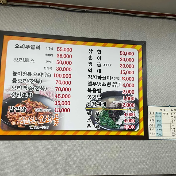 매장 전경 사진입니다. 오리탕, 삼겹살, 모듬생선조림, 김치짜글 등을 먹을 수 있는 곳이다.