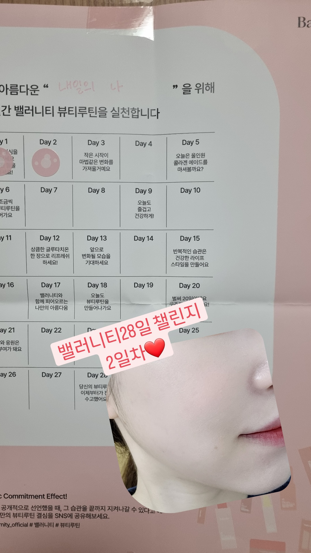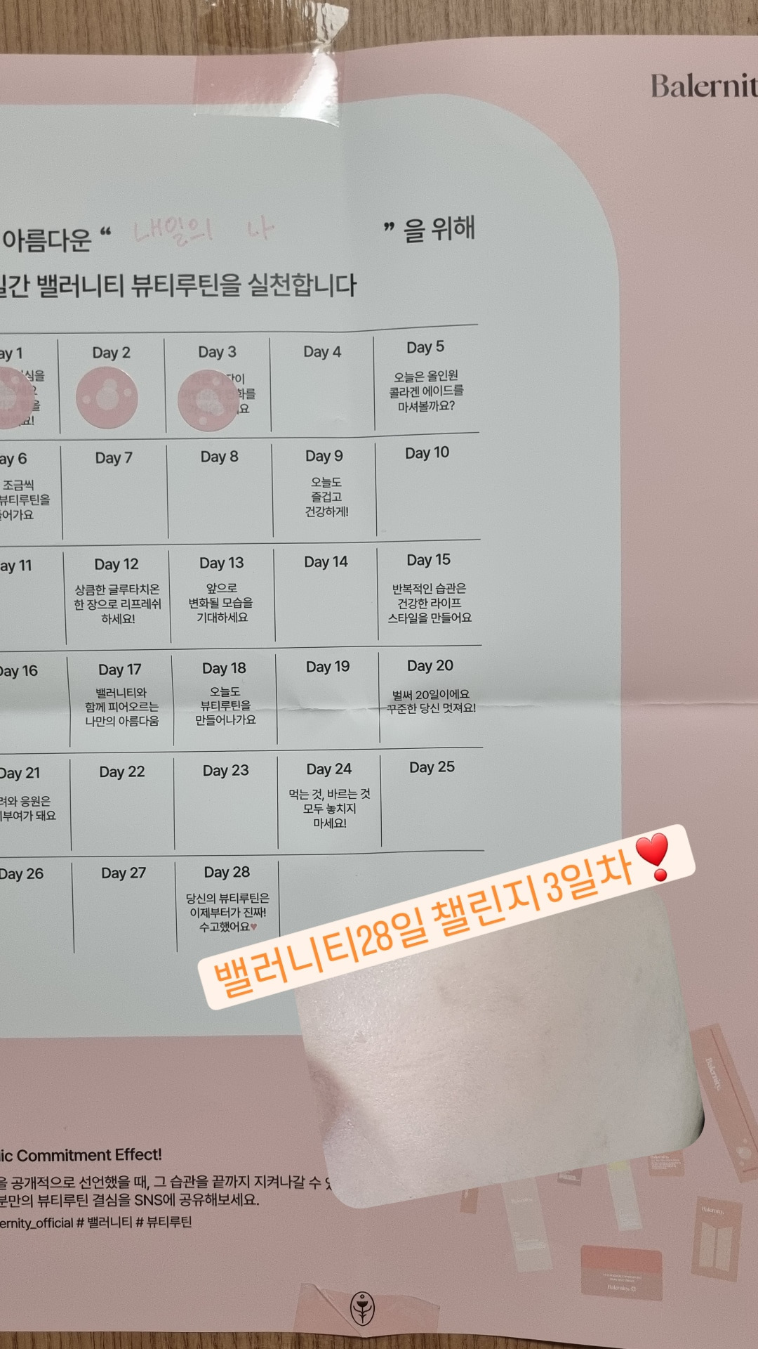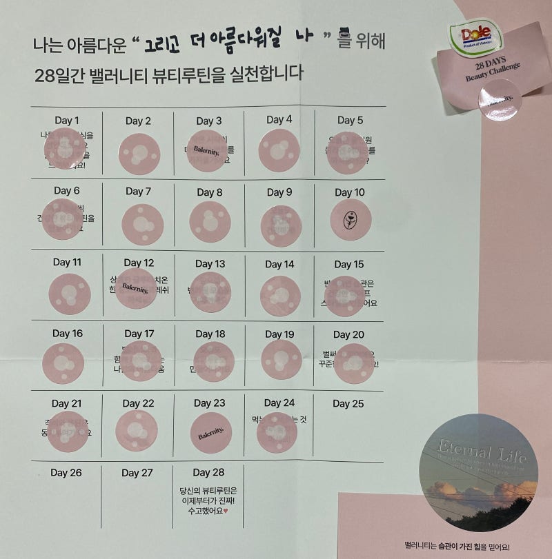 균형감각을 갖춘 챌린지 캘린더입니다. 어렸을 때 했던 워크시트가 생각나고, 스티커를 붙이는 맛이 더 열심히 참여하고 재미있게 할 수 있을 것 같아요. 말이나 글로 결심을 선언하는 것이 습관 형성에 큰 도움이 된다고 해서 저도 응원!! 28일간 어김없이 뷰티루틴으로 내면과 외면의 아름다움을 관리하겠습니다.