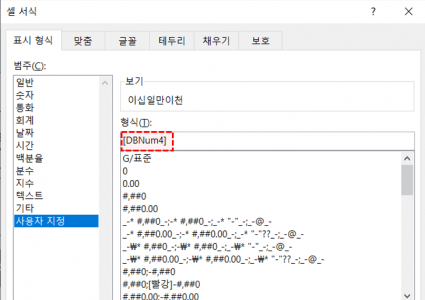 03먼저 엑셀 숫자를 한글로 변환할 때와 마찬가지로 엑셀 숫자를 일금과 원원으로 앞뒤로 래핑하는 함수를 사용해 보겠습니다. (Cell Format)에서 (Category)를 (Custom)으로 선택하면 (DBNum4)G/Standard와 동일하게 작성된 것을 확인할 수 있다. 아래 사진에서 빨간색으로 표시된 부분이 제가 직접 편집할 수 있는 부분입니다. 앞면에는 ‘일금’, 뒷면에는 ‘원정’이라고 적습니다. 띄어쓰기가 필요한 공백은 큰따옴표 안에 넣어야 한다는 점을 잊지 마세요! (보기)에서 정상적으로 보이면 (확인)을 클릭하여 적용하세요.