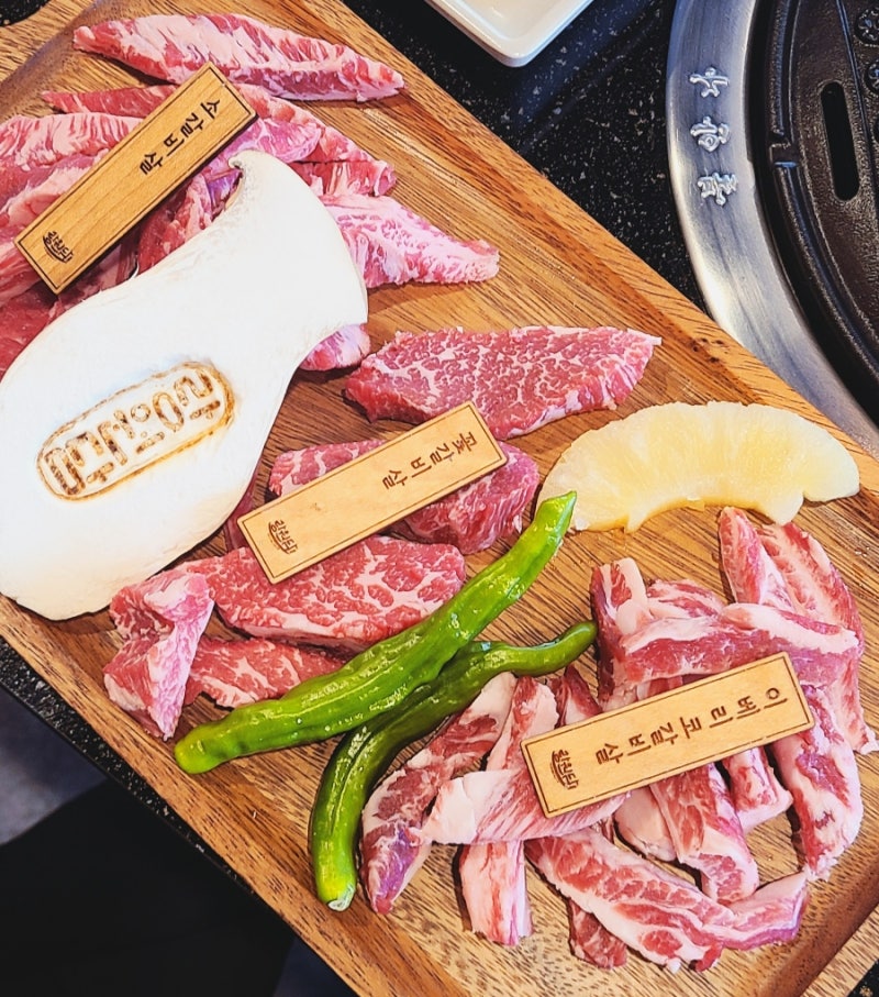드디어 고기가 나옵니다. 알록달록한 색감부터 먹음직스러워 보이는 우이동 고깃집 랑원담의 담 세트입니다. 소갈비살 200g + 꽃갈비살 120g + 황금살치살 120g + 부채살 200g이 고기 도마 위에 아름답게 놓여있습니다.