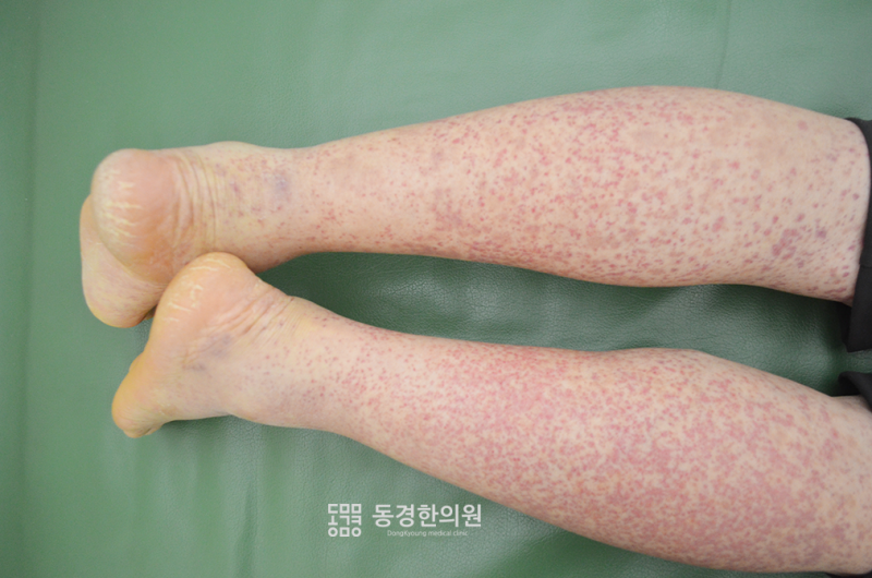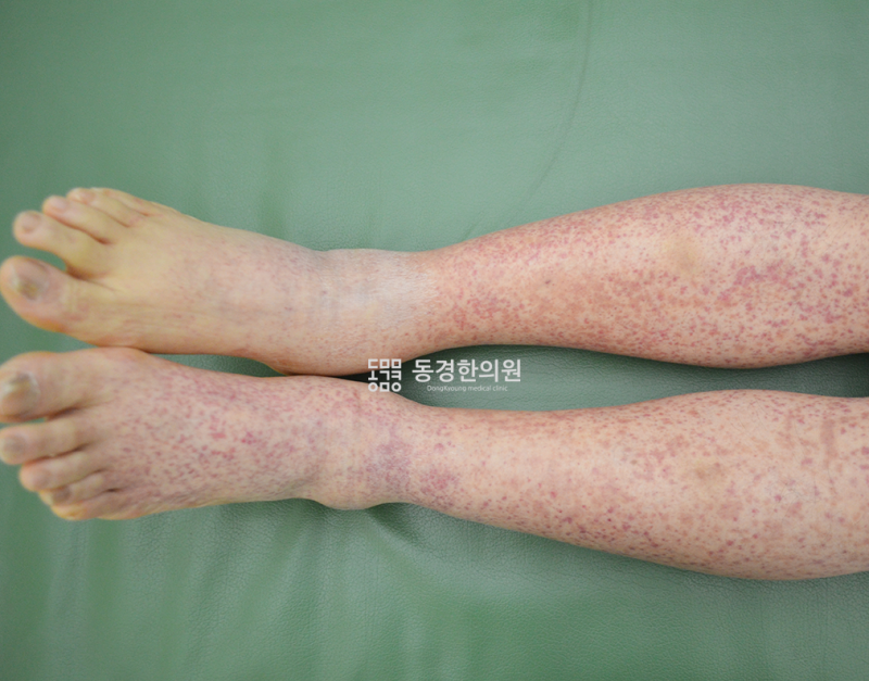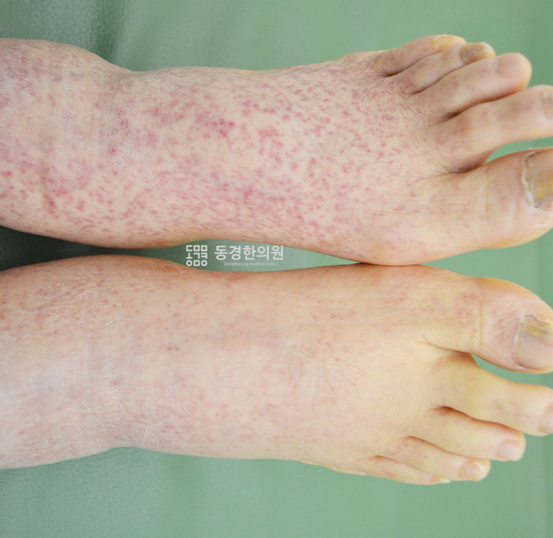 자반증은 피부에 반점이 나타나는 상태입니다. 자반증은 적혈구가 진피층으로 새어나와 피부가 붉거나 자주색으로 변하는 질환으로 압력을 가해도 변화가 없다. 영향을 받는 지역. 자반병과 반점상은 같은 병변으로 크기에 따라 자반병과 반점상으로 나뉘는데 구진성 홍반, 즉 자반병이 있는 피부가 주위보다 위로 올라오면 촉진성 자반병이라고 합니다. 혈관에 염증이 생깁니다.