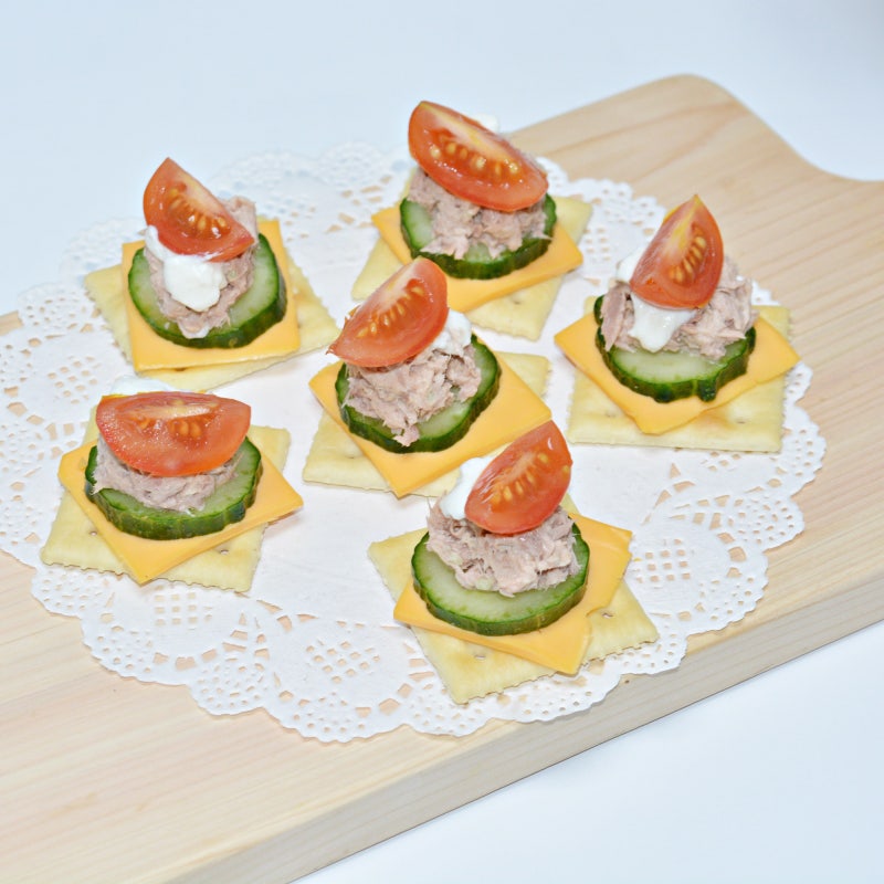 크래커와 얇게 썬 빵으로 만든 카나페에 참치 샐러드, 치즈, 햄, 과일, 야채 등을 얹어 간단한 레시피로 즐길 수 있는 핑거푸드이다. 눅눅한 체다 치즈, 고소한 참치, 아삭아삭한 오이, 신선한 토마토를 곁들인 크래커를 집에서 쉽게 만들 수 있습니다. 보기에도 먹음직스럽고 맛과 식감도 좋습니다.