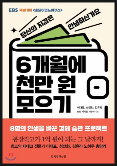 서론이 너무 길었습니다 ㅎㅎ 다들 이 중 하나쯤은 해당된다고 생각하시죠. 전혀 적용되지 않는다면 보지 마세요. 하하하 나는 나의 소비 패턴을 아주 잘 알고 있다. 문제는 알면서도 고치지 않는다는 점이다. 그래서 책에 나오는 도전자들처럼 어느 정도의 강박이 필요하다고 생각했고, 나도 이런 경험을 하게 된다면 도전해보고 싶다는 생각을 계속하게 됐다. 학생들과 함께 6개월 안에 1000만원 모으기 목표를 향한 저축과 저축 기술에 대한 정보를 담았습니다. 사회초년생이나 저처럼 돈이 많이 새는 사람들에게는 기초부터 쉽게 쌓을 수 있어 많은 도움이 될 것으로 예상됩니다. 광고 후 계속됩니다. 다음주제작성 취소, 은행계좌로 가세요!!!