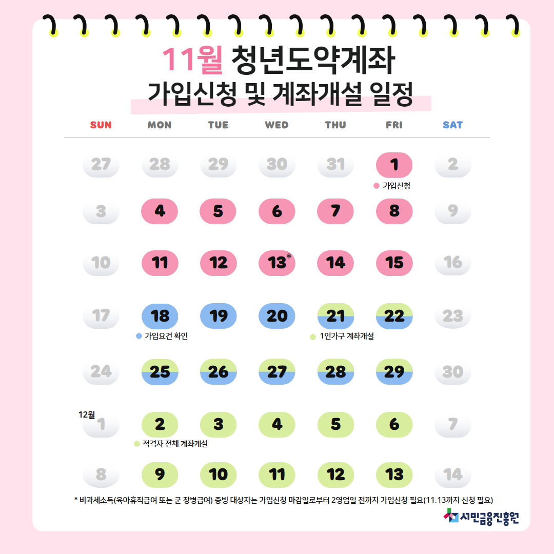 11월 청년도약 계좌 신청은 11월 1일부터 시작되어 이번주 금요일인 11월 15일까지 진행됩니다. 앞으로 5일 정도 남았으니 아직 고민 중이시라면 5일 이내에 신청하셔야 합니다. 구체적인 일정은 다음과 같습니다. .
