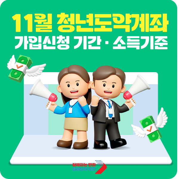 11월 청년도약계좌 신청 일정이 이번 주에 마감됩니다. 오늘은 11월 청년도약계좌 주요 내용에 대해 알아 보겠습니다. 11월 청년도약 계좌 주요 내용 : 신청/개설 일정