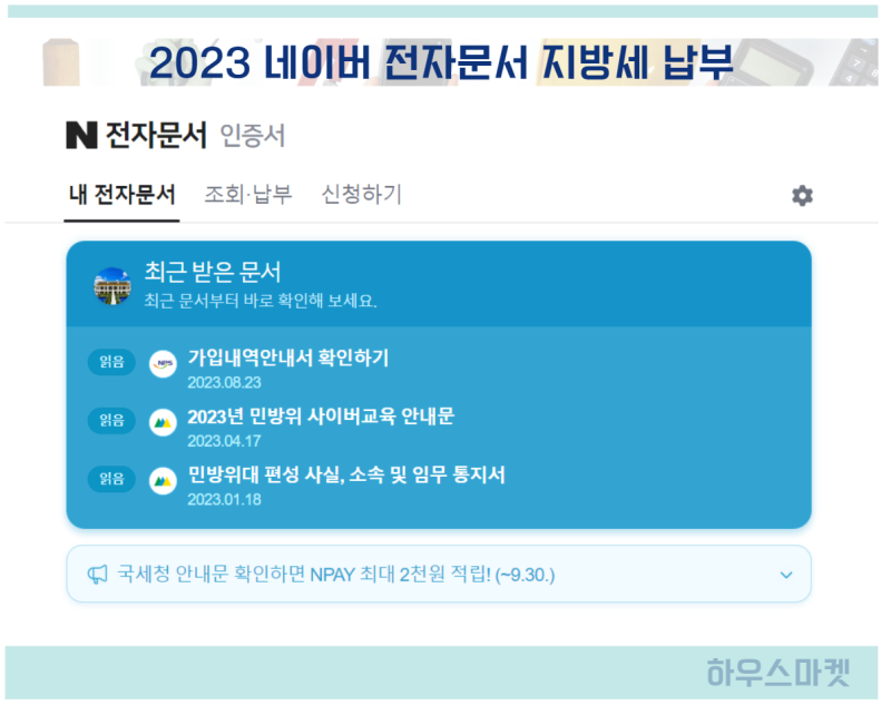 3. 9월 재산세 확인 방법 네이버나 기타 금융앱에서 전자문서로 등록할 내용이 있는 경우, 납부할 재산세가 있을 때 자동으로 전자문서로 청구서를 보내주기 때문에 쉽게 확인할 수 있습니다. 전자문서를 등록하는 경우 등록하지 않은 경우에는 집으로 종이청구서가 배달되거나, 위택스에서 직접 지방세를 검색해야 합니다. 4. 재산세 계산 방법