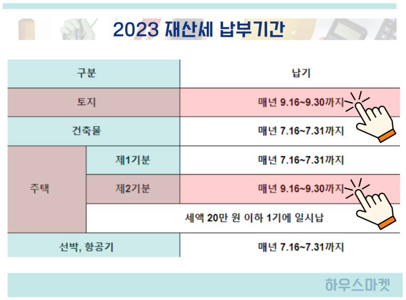 1. 9월 재산세 납부기간은 9월 16일부터 10월 4일까지입니다. (원래 9월 30일까지였으나, 추석연휴로 인해 4일까지 지속될 수 있습니다.) 이 한도를 초과할 경우 3%의 추가요금이 부과됩니다. 30만원 초과시에는 0.75%가 추가되어 총 3.75%의 추가요금이 부과됩니다. 기한 내에 결제해주세요.2. 9월 재산세 항목 : 선박, 항공기 등 자기 명의의 건물을 포함해 7월에 1차 주택분할에 납부하는 지방세와 달리 9월에는 2차 주택과 토지분만 납부하면 된다.